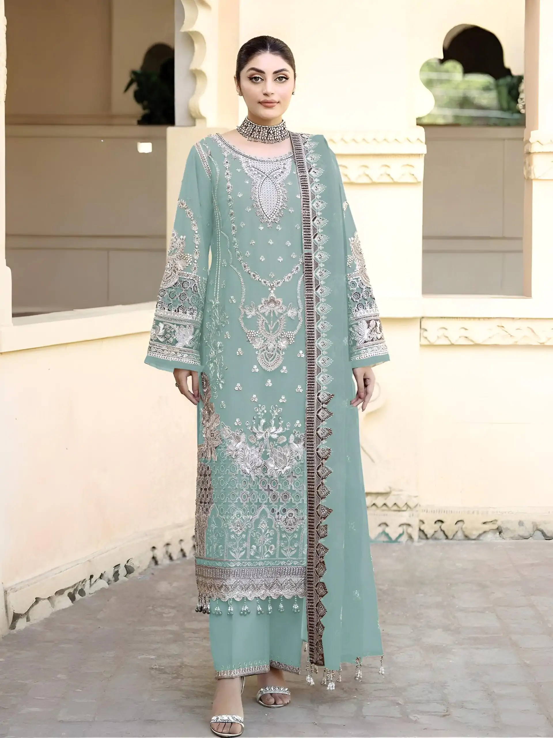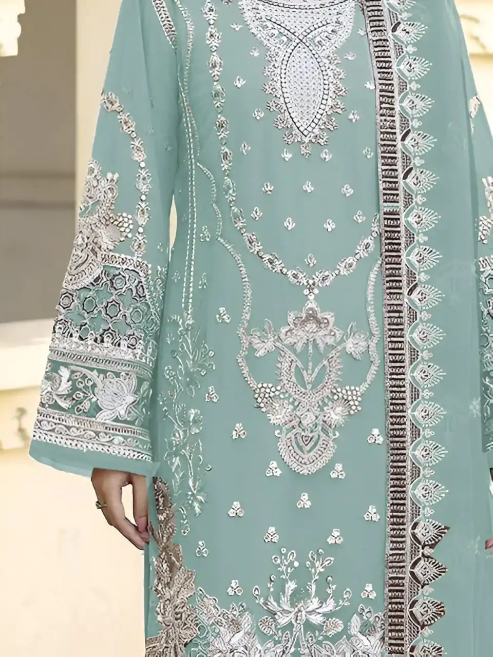 Is suit ka soft mint green shade delicate silver thread aur zari embroidery ke sath ek fresh aur graceful look create karta hai.